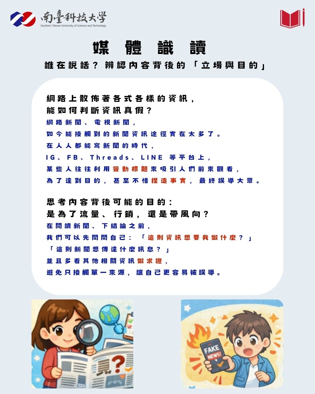在閱讀新聞、下結論之前,我們可以先問問自己:「這則資訊想要我做什麼?」、「這則新聞想傳達什麼訊息?」並且多看其他相關資訊做求證,避免只接觸單一來源,讓自己更容易被誤導。